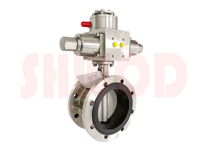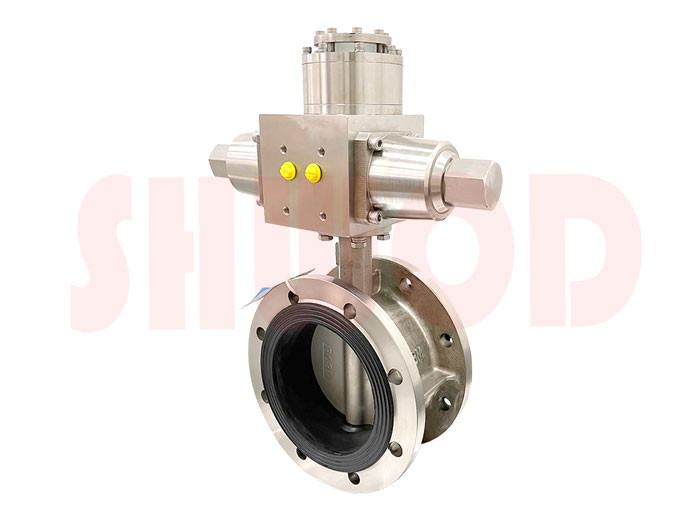 水下液动蝶阀采用液动执行器和蝶阀组合。以液动执行器作为动力源,通过双向齿轮泵输出压力油,经油路集成块的控制送至油缸,实现活塞往复运动,同时通过曲柄转动阀轴、阀板作90度范围旋转,达到调节流量的目的。