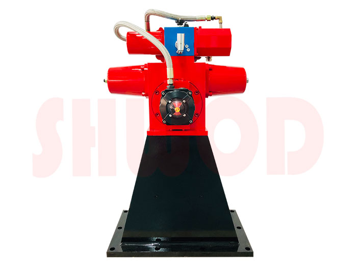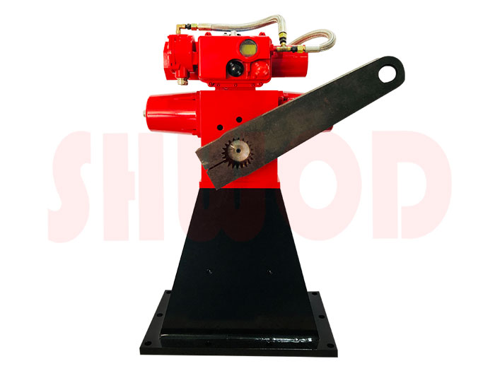 FDM系列智能型电液执行器由支架,双作用齿轮齿条执行器、液压动力源和电气控制系统组成。 其中液压动力源包含电机泵组以及手动泵。