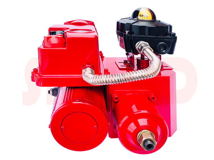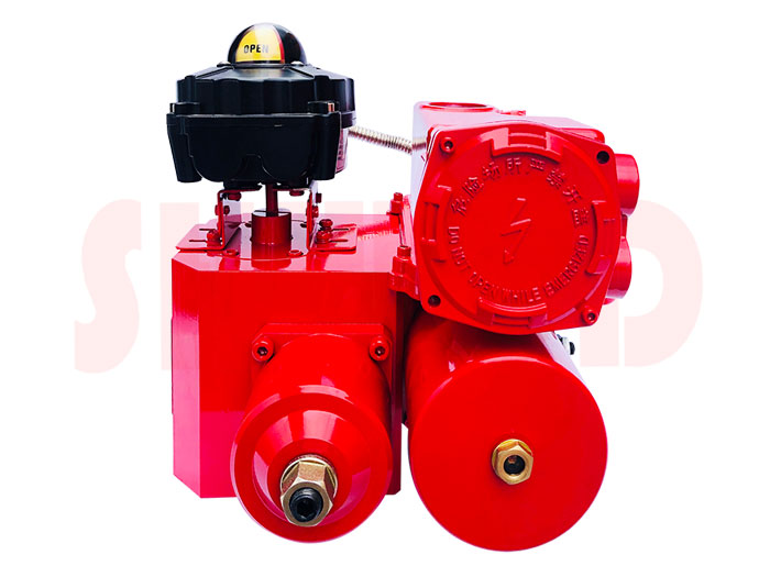 电液执行器由支架,双作用齿轮齿条执行器、液压动力源和电气控制系统组成。 其中液压动力源包含电机泵组以及手动泵。